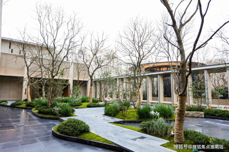 穿过公园进入社区前场,约10米高的「精神之门」矗立;步入社区,先是6米高水幕,随后下沉式山水庭院映入眼帘。