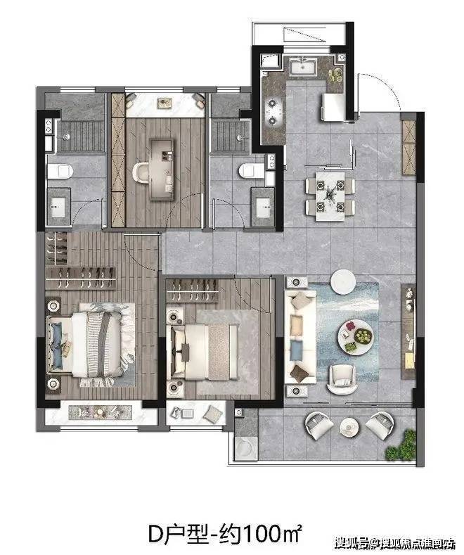 建面约121㎡ 4房2厅2卫,宽境4房,拓宽空间尺度;大开间、进深短,通透采光;主卧独立卫浴,优雅随心的寝居感受。