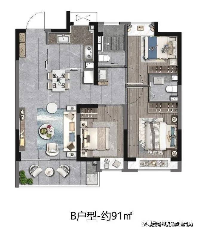 建面约91㎡3房2卫,三开间朝南,客餐厅连通大阳台,四飘窗设计,好户型该有的素质它都有。