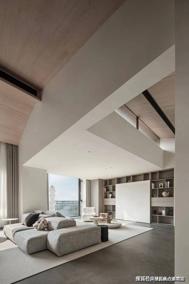 倾斜的吊顶和特意做出的错落 “断层”,增强了空间的纵深感。这种感觉不是来自单一方向,而是四面八方的张力共同形成的。