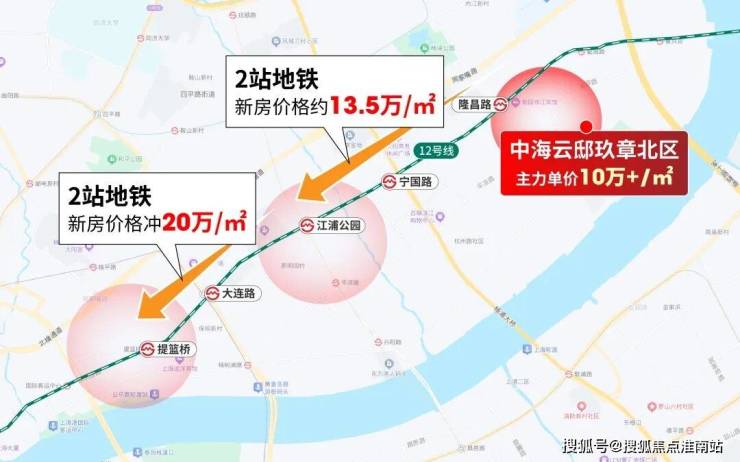 我们沿着地铁线路看价格, 项目出发2站地铁就是江浦公园,这里的新房已经要约13.5万/㎡。相比云邸玖章10万+/㎡的单价,地铁 2站贵3万/㎡, 安全垫不言而喻!