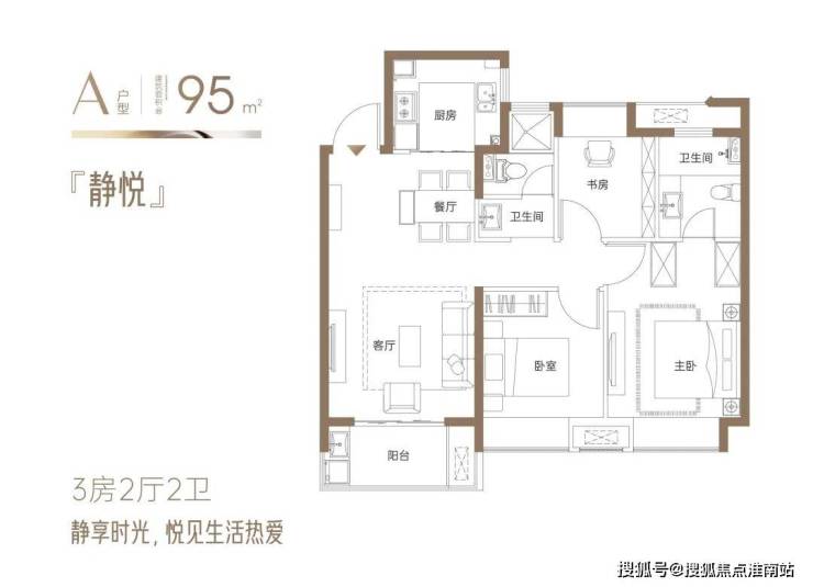 『静悦』约95㎡3房2厅2卫:三开间向阳户型,面朝风景,沐浴阳光;全明通透,让阳光照进每一寸惬意生活;户户飘窗,逐光而居,延伸空间尺度;全明卫设计,赋予私密空间明亮与清新;。方正有序的空间艺术,舒适实用,张弛有度
