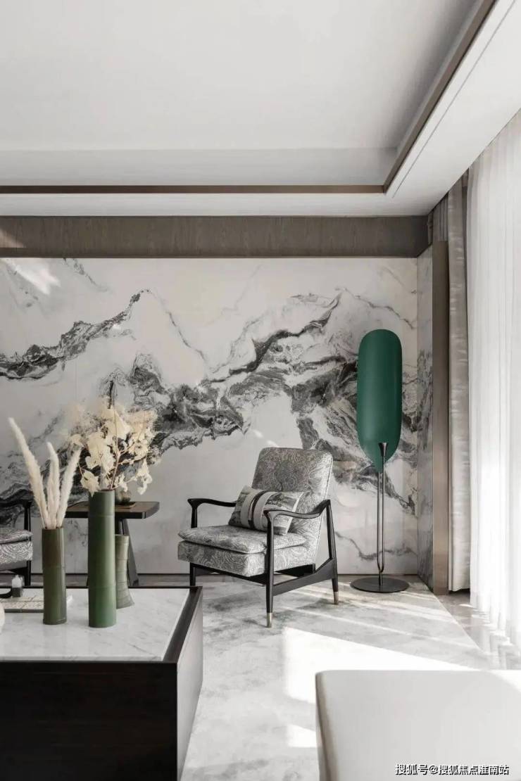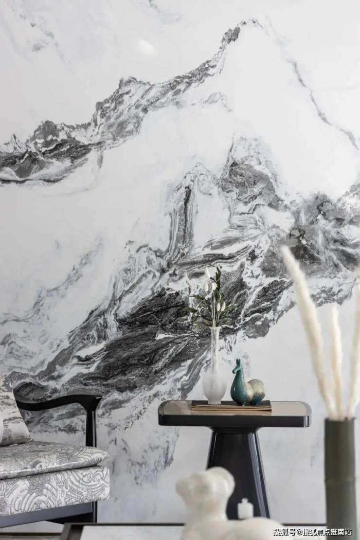 走进客厅之中,仿佛步入一幅山水画作之中一般.组合式的大理石岩板背景墙,以屏风式的形制,赋予了空间一派悠然自得的气韵.