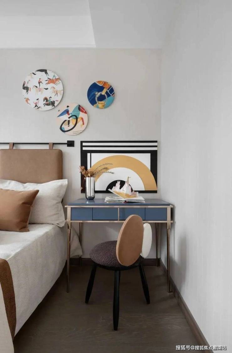 而男孩房的设计更显得元气满满,不管是吊灯或是床头柜,还是书桌设计都更具一派属于少年的天真烂漫之感.