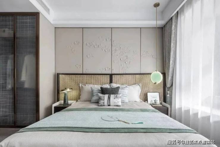 藤编式的大床,还有青色的灯具,都让整个主卧更有一派儒雅之美.