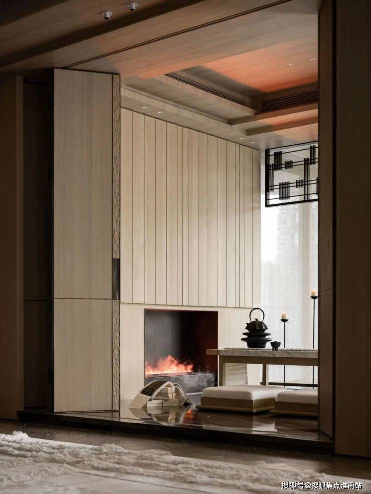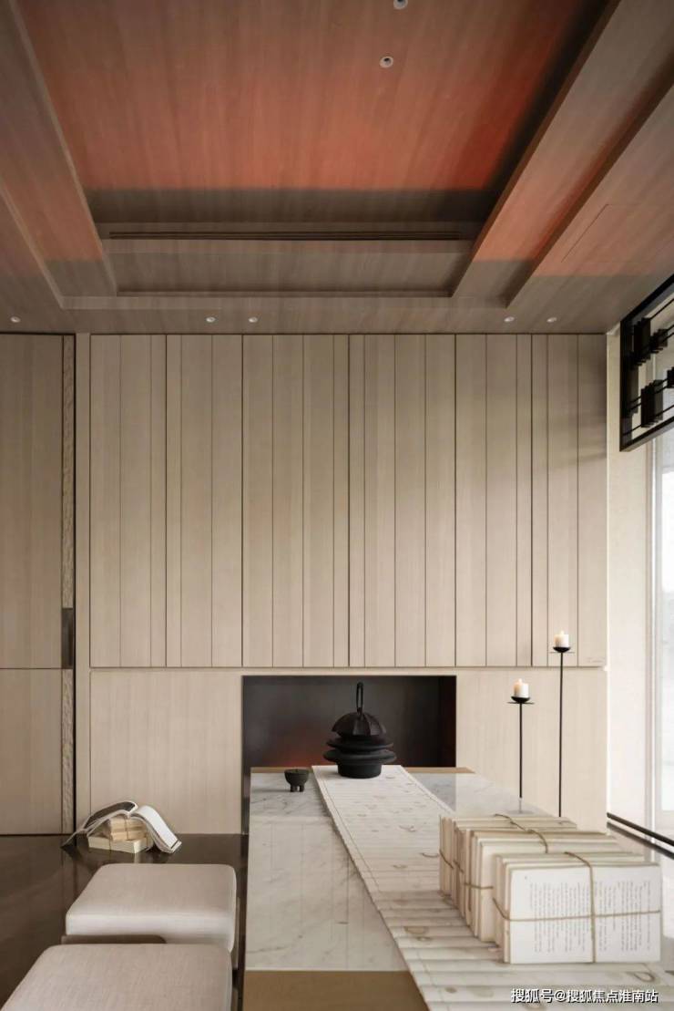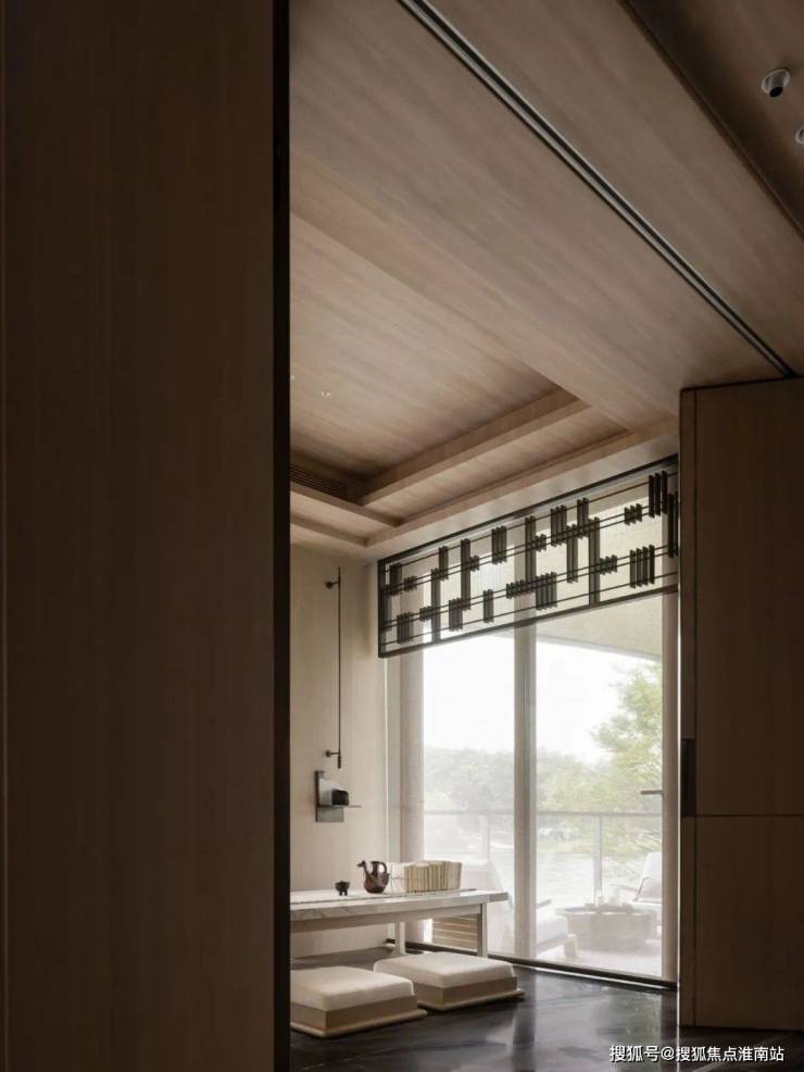 对于一个家庭空间来说,能够利用的户外景致是稀缺资源,此处设茶室,以对称的主坐和跳跃的顶部隔断形成对比。