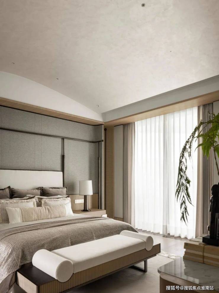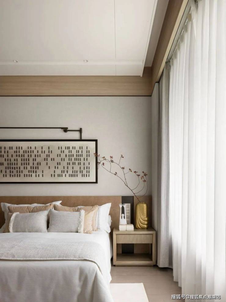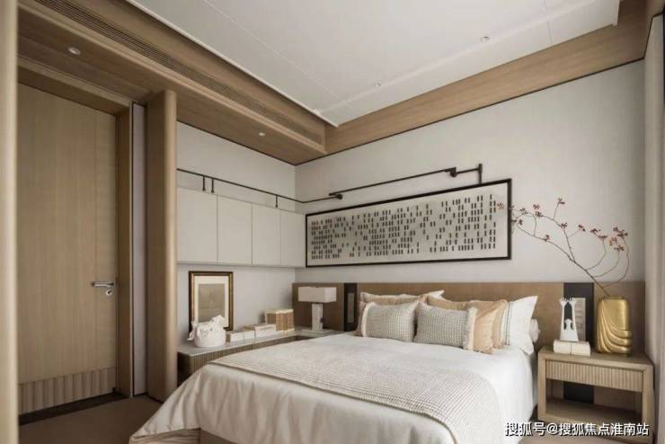 “卧室是藏风纳气之地,温馨的色彩材质和紧凑的流线布局将气韵收束于空间之中,讲求对称的布局也很好的把所有的重心落置在床榻区域。”