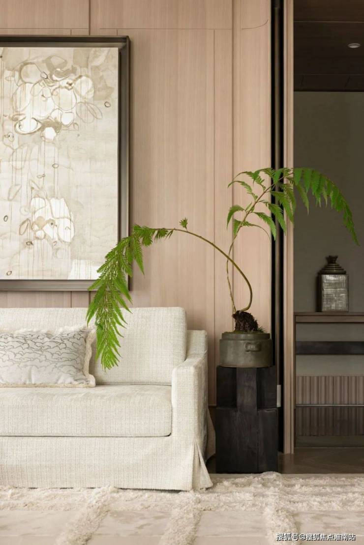 顺应着硬装的线条和色彩,客厅的陈设大量选择了温暖的浅色从而贴近木制。绒面沙发与东方纹样靠枕形成了视觉的引导。