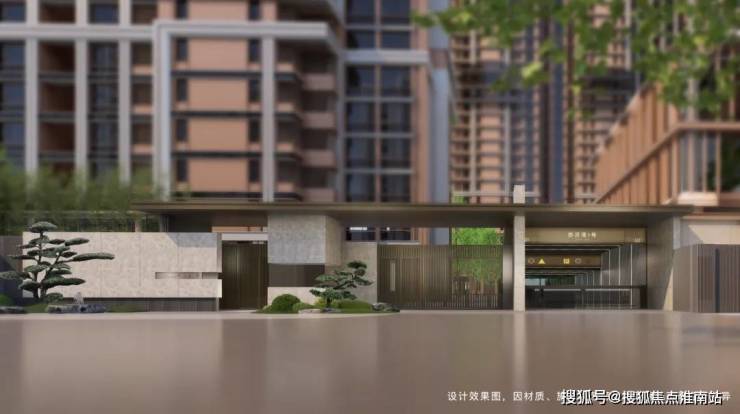 社区大门打造归心庭,社区入口墙面升级为云朵拉灰石材及金属格栅,渲染非凡尊崇的意境,过渡繁华喧嚣与归家静谧,满满的归家仪式感~