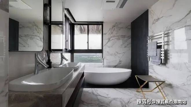 ▲墙面、地面处都是以白色砖的设计,靠窗布置一个大浴缸,结合双人位的台上盆洗手盆,也让卫浴空间显得更加干净简洁而时尚大方。