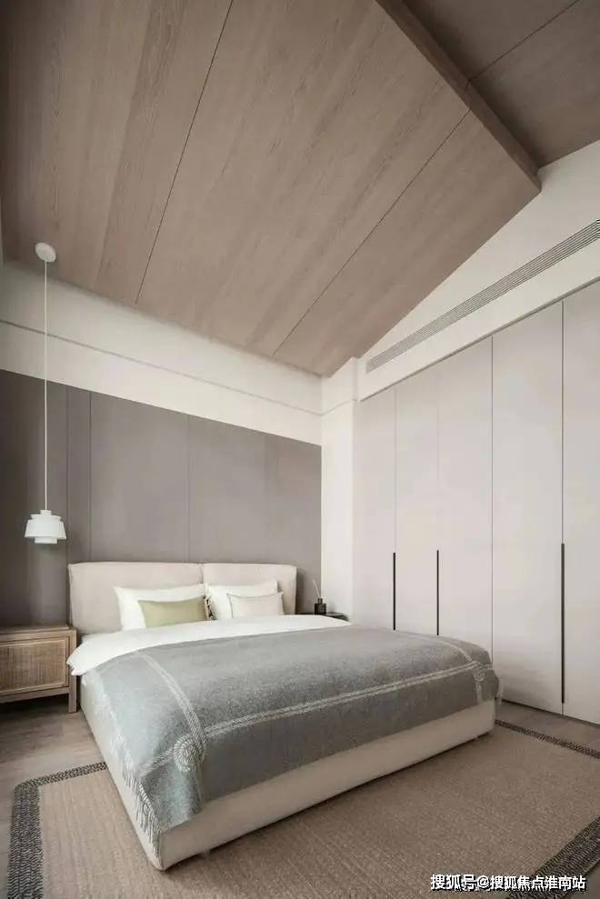 次卧的设计比较简约,经典的色调让房间一直很温暖。独特的拼贴式吊顶设计解决了不规则的角度和边缘问题,空调出口也做了美化,不影响美观。一侧的背景墙里嵌入了衣柜,保证了实用性。整个空间有一种平静又永恒的美感,简约风格的魅力很明显。