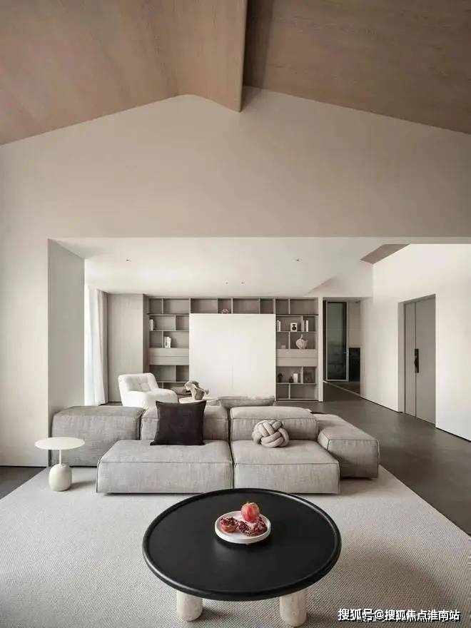 倾斜的吊顶和特意做出的错落 “断层”,增强了空间的纵深感。这种感觉不是来自单一方向,而是四面八方的张力共同形成的。