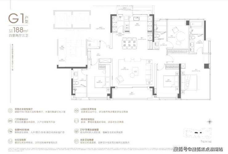 188户型2梯2户,有独立的电梯厅。4房3卫设计,还是3明卫,这两点还是不错的。