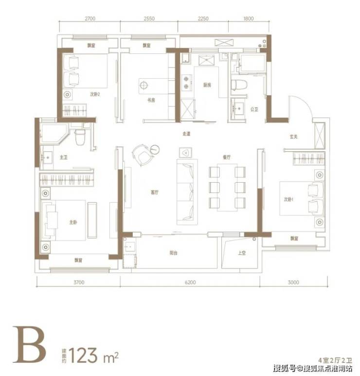 建面约123㎡做到了4房,且客厅面宽达 6.2米,主房间宽达 3.7米,且北面2间小房间根据需求可打通。