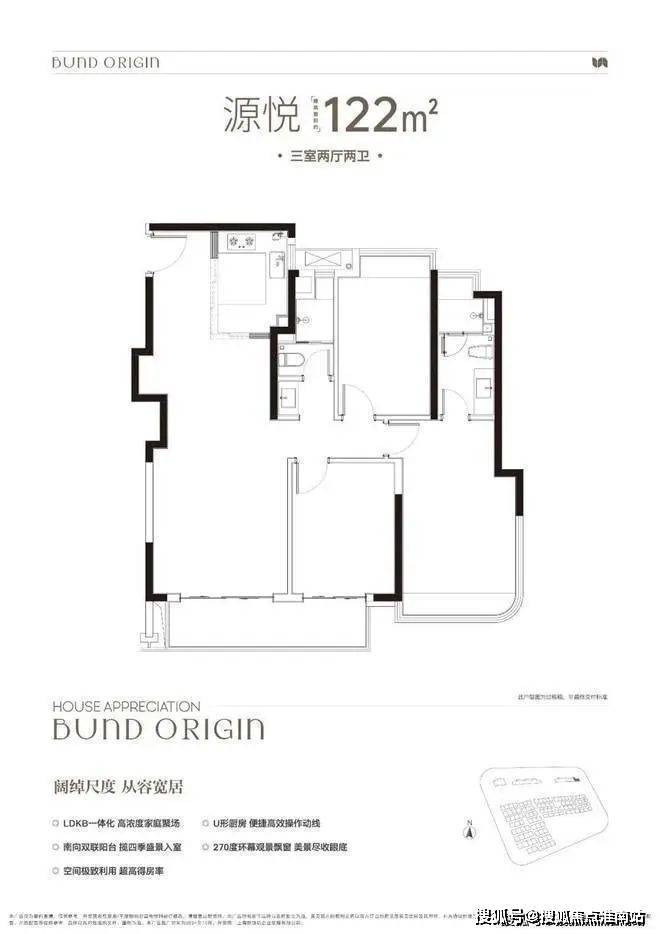 建面约122㎡3房2厅2卫,非常标准的动静分离、三开间朝南户型。