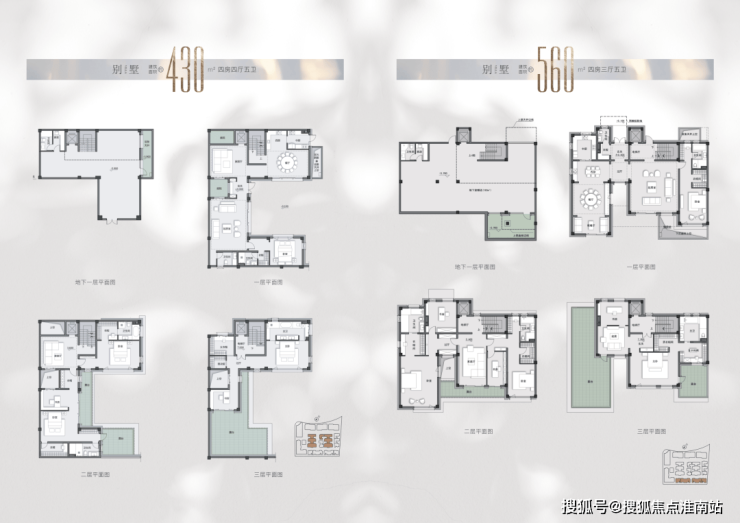 别墅是大头,且都是拼接型别墅:地上三层,地下一层, 从430㎡、560㎡、690㎡三种,都是四房四厅五卫的设计。