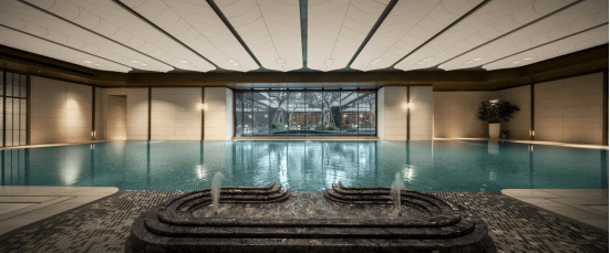 恒温泳池:第一,采用了景德镇烧制的陶瓷马赛克,独特的釉面色彩由 景德镇老师傅手工浇筑而成,充满人文艺术底蕴;第二,羽毛天花造型,由600余件铝板打造,表面采用了仿贝壳纹的艺术漆处理,带来松弛度假感;第三,不仅配置了约25m×10m的4道泳池,还采用了 奥运会同款空调除湿系统,彰显高档品质细节!