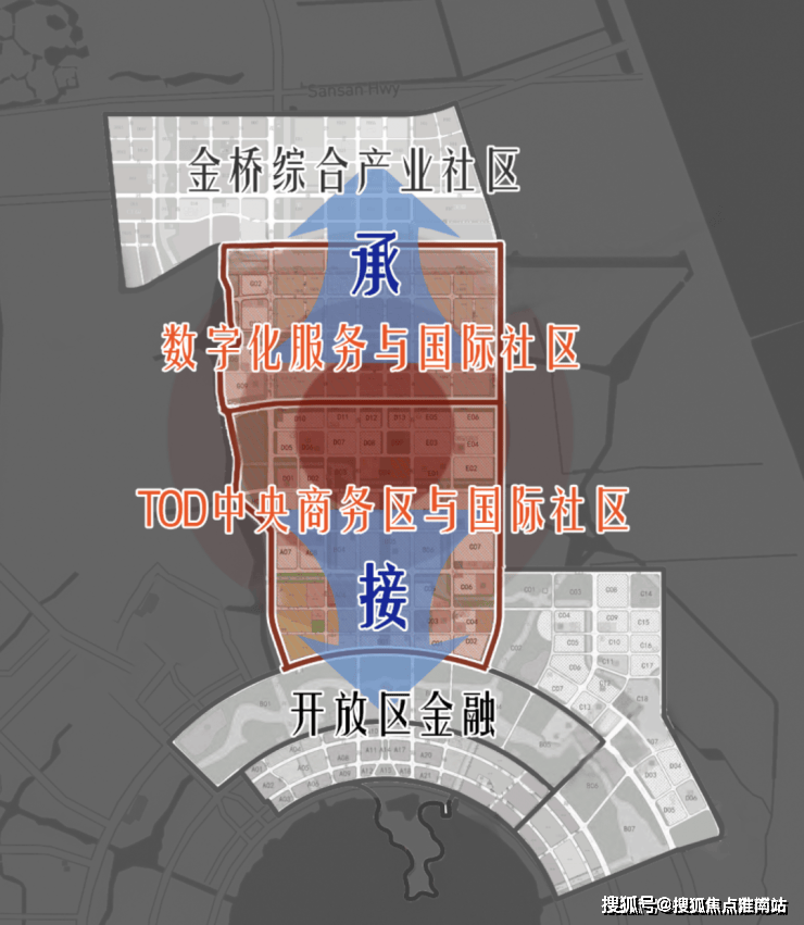 浦东新区的“联洋&碧云”国际社区,西侧“临”陆家嘴金融城,东侧“连”金桥经济技术开发区,而临港105片区数字化服务与国际社区同样北面“承”金桥研发产业,南面“接”开放区金融,两者有异曲同工之妙。
