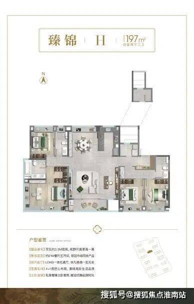 南向3.5面宽边厅的户型设计,一梯一户的电梯厅基本可以独享;客餐厅一体化设计,270°的超广视角,居住者足不出户就能坐拥长卷式观景体验;南向双套卧设置,实现精致而又尊奢的世家生活风范。