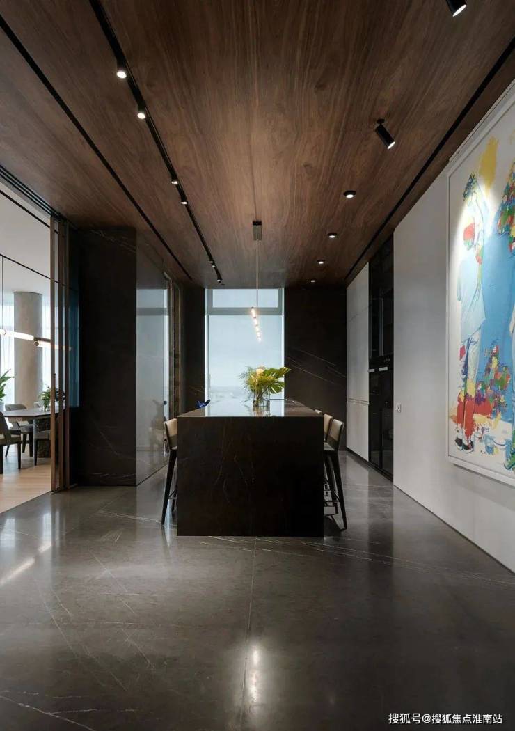 大大的空间,视觉感强烈,移动的玻璃门把客厅和厨房餐厅隔开,中央岛台和餐厅一体,线条简单,原木色天花和光线烘托出强烈的戏剧感。