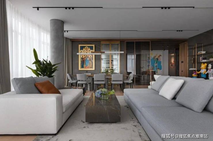 由设计师Artur Sharf,Artem Zverev,Alesia Riamova,Anya Tarabanova,Gleb Brizhanov共同设计,客厅以灰白色为主,与金属材质搭配,加入工业风元素,使得格调满满的,纯粹而惊艳。