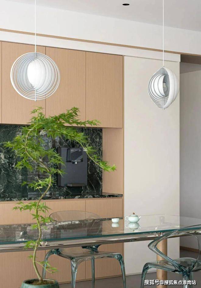 餐桌和餐椅采用了亚克力材质,半透明的特性让整个区域显得更加轻盈,视觉上扩大了空间感。