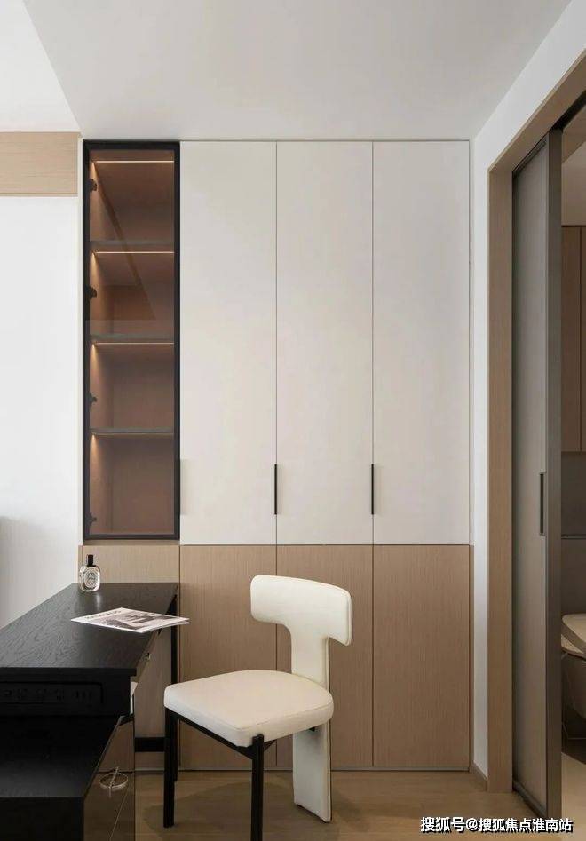 一间卧室被改造成了书房,拆除了与客厅之间的墙体,采用玻璃移门进行隔断,形成了一个可开合的书房空间,既保持了通透感,又增加了功能性。