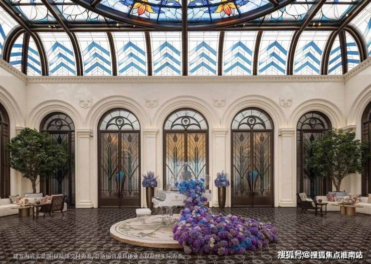 以玉兰门庭—迎归大堂—莳花荟为主轴,敬献步履生辉的归家艺旅:玉兰门庭如繁花盛绽,尊华瑞鳞水景聚运生财,双尊铜狮镇守家宅;迎归大堂流转光影艺韵,百羽栖澜艺术雕塑、芦海宸韵非遗绣作流淌摩登气韵;莳花荟中央会客厅移步异景,献映会客、休闲等雅会。