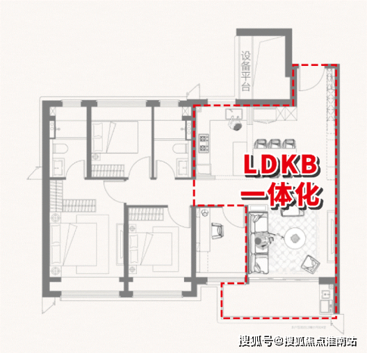 LDKB一体化的设计恰到好处的解决了面积不够的问题。 厨房、餐厅、客厅三大空间联通,不仅通透感十足,还构建了一个利用率超高的家庭核心区,在这样高度开放的空间里,即使互不交流,也能保持交流和关注!