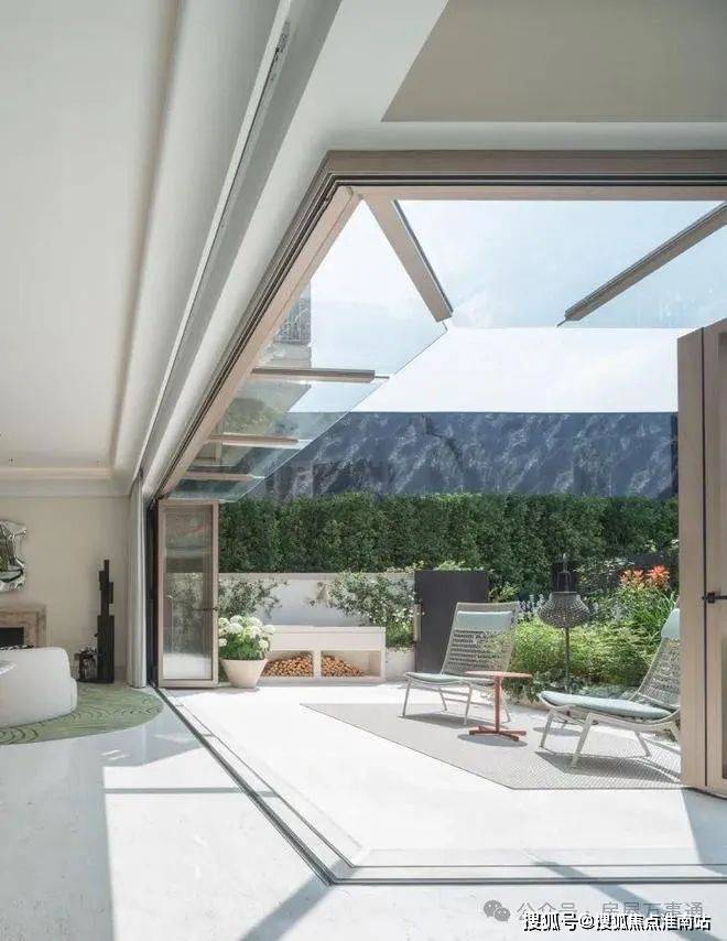 「无界空间」:客厅270度转角无柱设计,搭配落地玻璃,开阔视野将院中风景迎入日常。