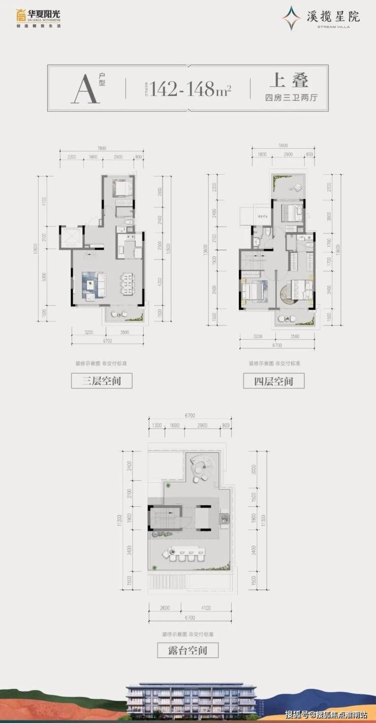 建面约142~148㎡上叠:约6.7m餐客连厅/豪华主卧套房/顶层景观阳台/U型厨房