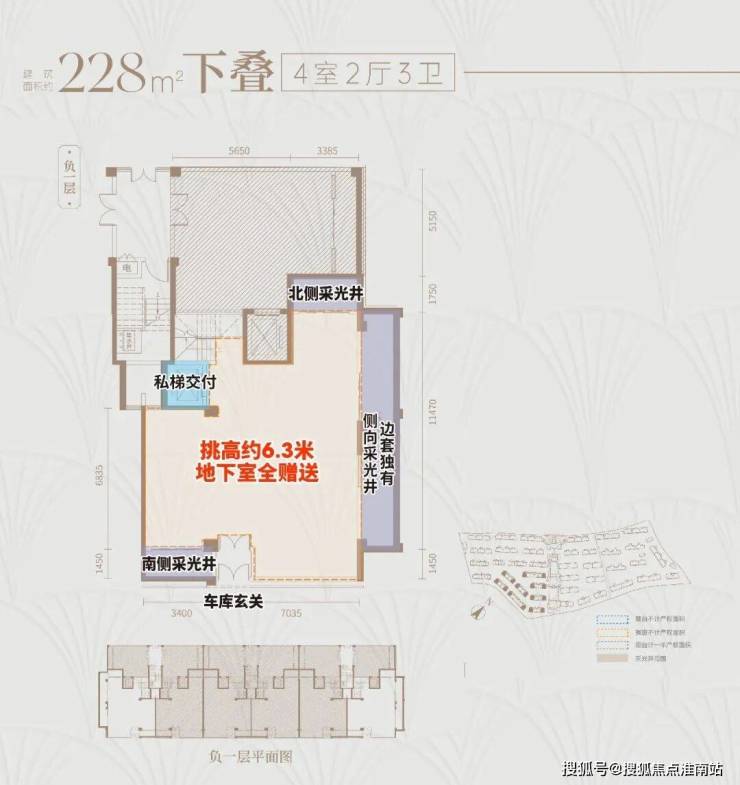 下叠户型地下单层面积约120㎡,层高达约6.3米,可以做双层使 用,增加夹层后, 地下空间可拓展至超200㎡ ,丰富的灵动空间足以满足业主的各类喜好!