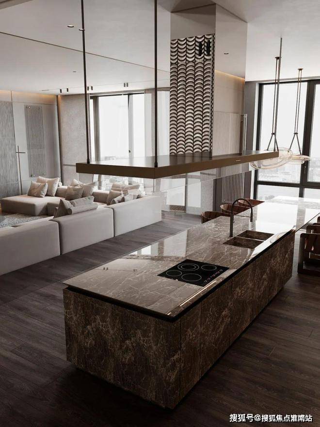 上海浦东绿宝园·翡梵售楼处电话:400-8818-994绿宝园·翡梵官方电话:400-8818-994整个餐厅的墙壁和天花板全部使用可视镜作为装饰,把客厅和餐厅的风景全部融合在一起,餐厅的餐桌和大理石岛台完全烘托出现代的氛围感。