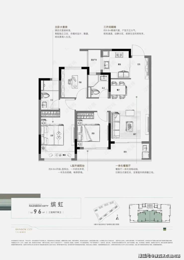 建面约96㎡的3房户型,总价维持了200万级的低门槛,对新杭州人家庭友好性十足的同时实用性拉满,约9.8米的南向尺度给一体化餐客厅与两间起居卧室带来南向采光,在覆盖一家人主要生活场景充足采光的同时,独立书房与朝南面宽约6.6米的L型阳台又能为生活体验增添更多可能性。