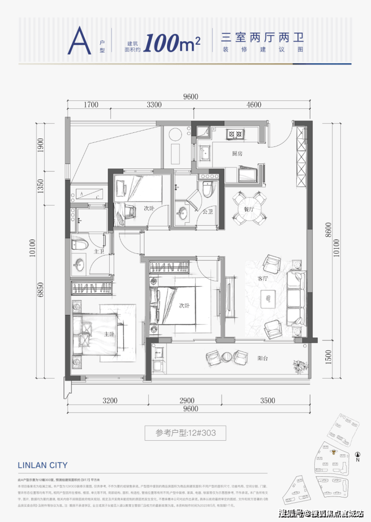 建面约100㎡三室两厅两卫:三开间朝南,南向面宽约10.2米,得房率高,适合年轻家庭