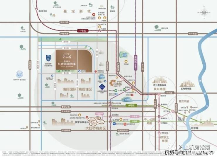 嘉定“十四五”将南翔纳入北虹桥综合商务区。南翔距虹桥核心区直线距离约13KM,享受大虹桥强势能级辐射。同时承接虹桥国际开放枢纽北向拓展带重要节点,一脉虹桥发展金线,南翔进阶大虹桥主城生活区,成为中央商务配套区和高品质国际化社区目的地。