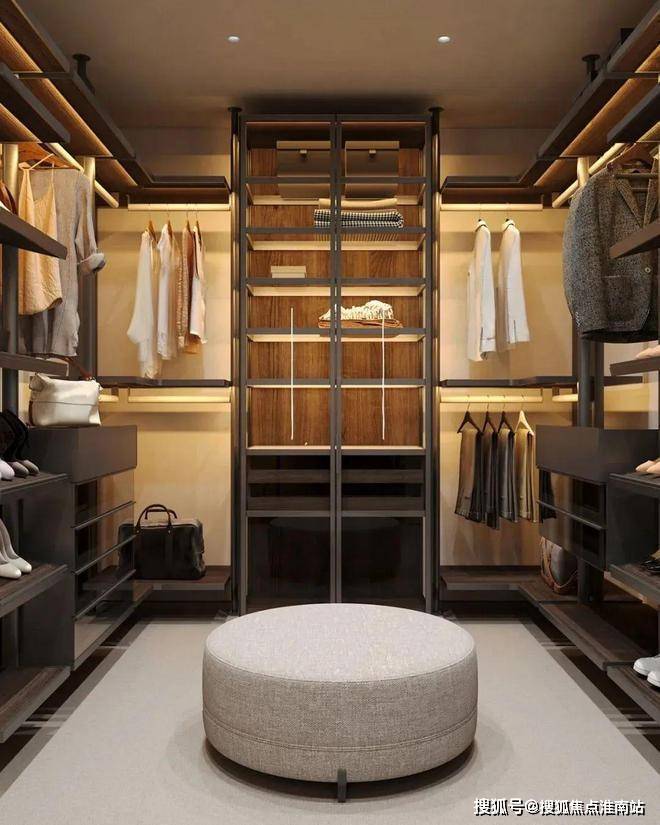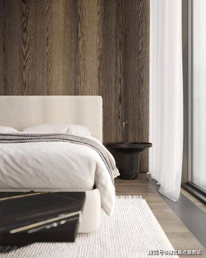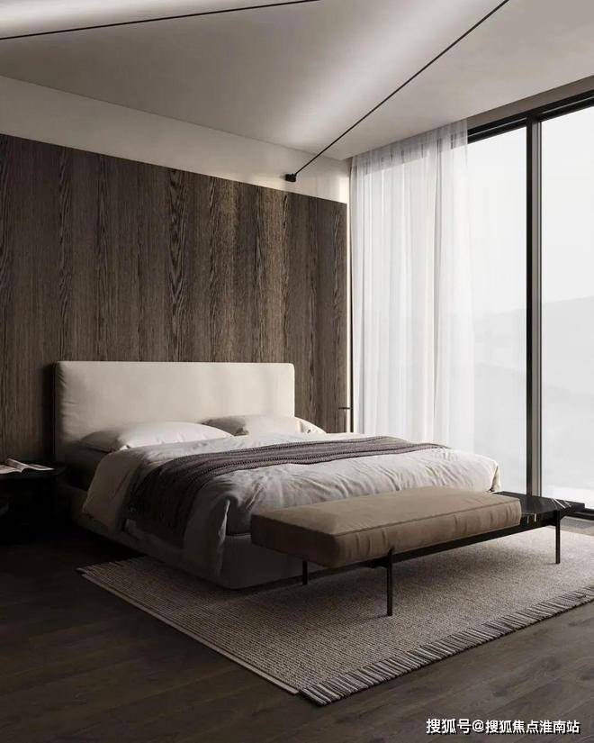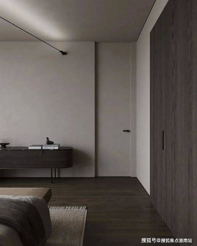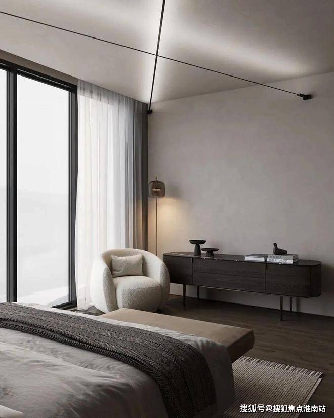 主卧的色调十分简约内敛,为屋主打造出了一个能够使人沉淀心灵的休憩空间。深木色的存在让空间更显厚重而沉稳,柔软而蓬松的白色床品与其形成了对比。床头灯的造型简洁却富有设计感,床对面的沙发椅能够让屋主在这里度过惬意的下午茶时光。衣帽间中则选用深色与暖调的灯光营造精致的空间氛围。