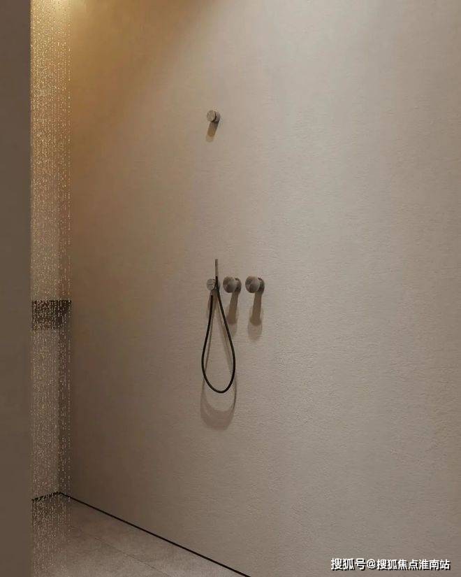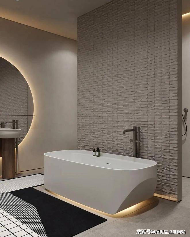 卫生间中,设计师选用灰白色作为空间的主色调,营造出一种舒适的轻盈感。圆形的镜面,让空间更显柔和与开阔。镜面背后的暖色灯光增添了空间的温馨质感。