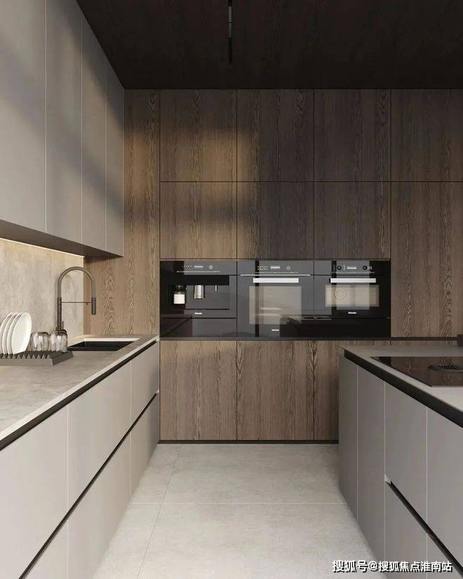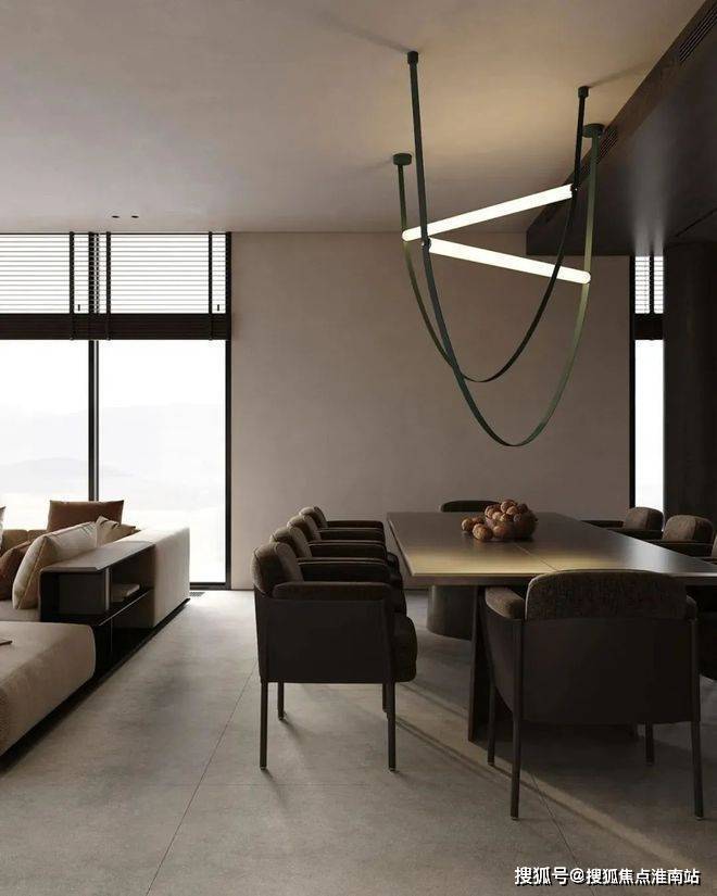 餐厅与厨房位于客厅的旁边,选用深色作为主色调,与客厅形成了对比。同时厨房做成了开放式的多功能厨房,包含了就餐、吧台与厨房功能,很好的利用了空间,兼具美观性与实用性。深色的餐桌搭配上餐椅,为屋主打造出了一个舒适的用餐空间,餐桌上方的吊灯十分吸睛,具有线条美感。