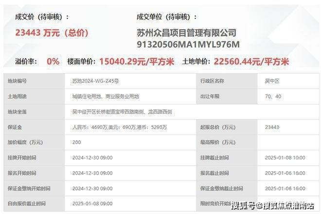 苏州蠡棠森屿售楼处电话:400-8818-994项目位于吴中区长桥街道宝带西路南侧、龙西路西侧,2024年由吴中建设以底价竞得,成交楼面价15040元/㎡。