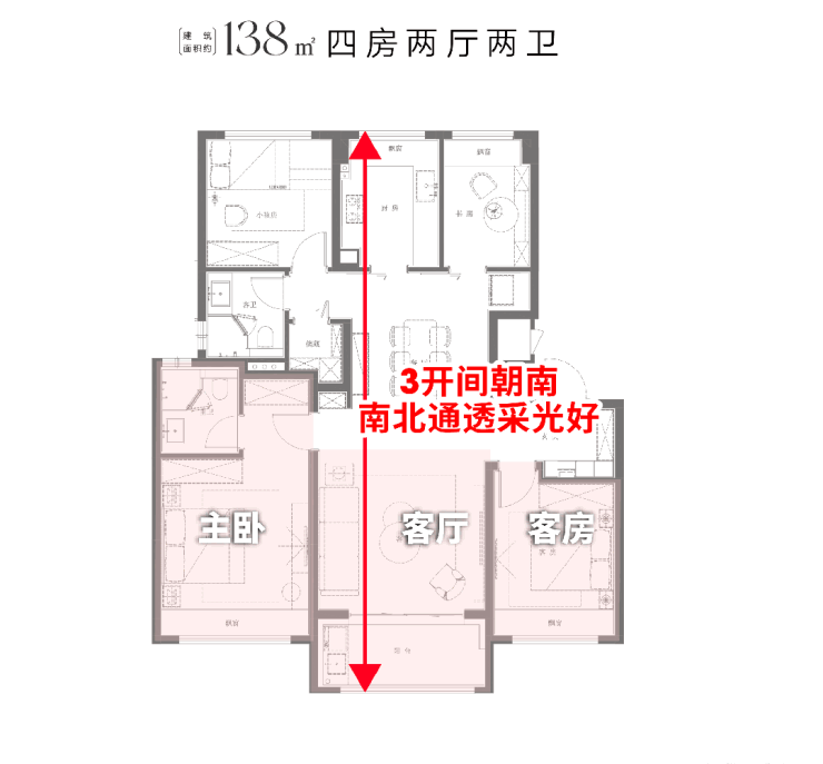 再次,项目主力建面约138㎡4房2厅2卫洋房户型,这是一个真四房真改善户型,各个卧室的尺度均好。