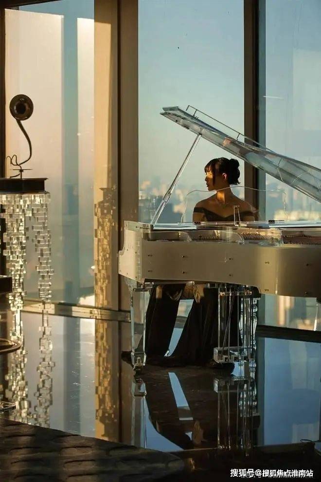 因热爱而珍贵——定制音乐区演奏空间中心区域,摆放手工玻璃吹制的艺术雕塑;柜内饰品与之呼应,陈放手作玻璃花瓶.日本KAWAI水晶钢琴,其透明材质愈发衬显空间轻盈;折光成彩,七色绚烂.
