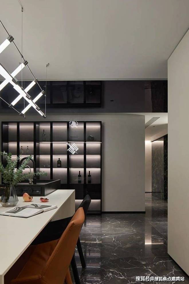 设计将高奢质感与现代主义相融,地面通铺【爱力蒙特∙黑金帝国石】石材独特的纹理,结合暗黑基调,将空间内敛的奢华与神秘感发挥到极致,给空间带来强烈的视觉冲击力.
