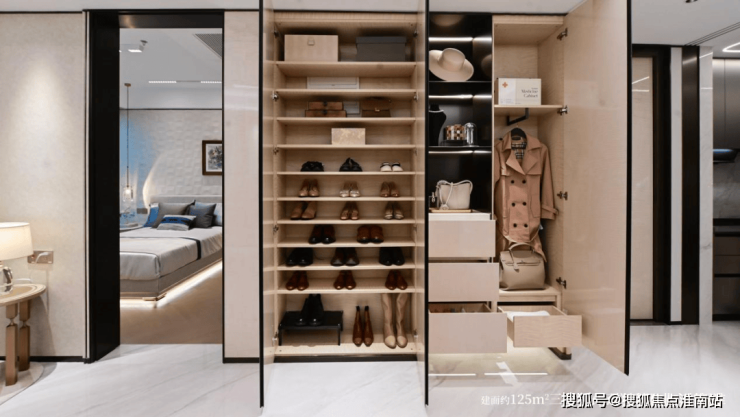 125㎡户型仅仅在客厅公区,就打造了三处 整面墙的柜子来做收纳,除了传统的收纳柜,还有隐藏推拉零食架、内嵌式吧台等创新收纳方案,从衣服鞋帽,到大件行李箱再到家用清洁工具,都有专属的安置空间。