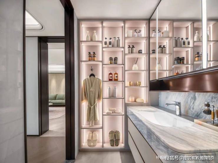 主卫镜柜收纳空间,满满的一面墙,还贴心配置了一个可调节温度的美妆冰箱 ,女主人看到了很难不心动!