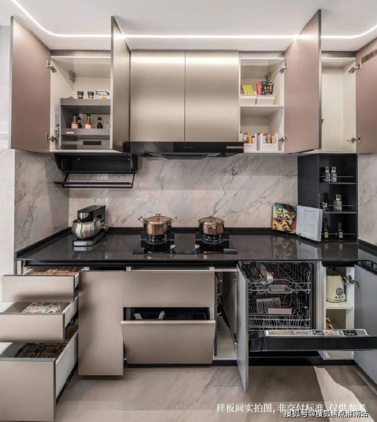厨房的收纳空间几乎能填满整个厨房空间,这些收纳空间不是随意塞满的,而是根据日常烹饪习惯的频率来贴心规划。