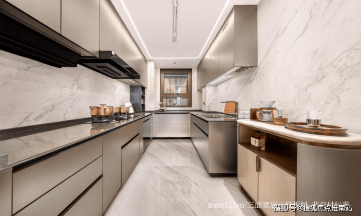 125㎡三房:三开间朝南,南向总面宽11.2米,客厅连接4.5米观景阳台,主卧配备独立卫浴和步入式衣帽间,厨房采用U型操作台;