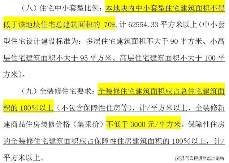 根据土地转让合同要求显示,项目中小套户型的比例要求不小于70%;全装修比例100%,装标不低于3000元/㎡(集采价)。