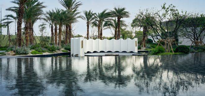 实景呈现的岛屿水院,作为保利天奕五座全球大师花园之一,在银海枣树阵、下沉式庭院、镜面池畔卡座的呼应中,成为未来居者沉浸自然的惬意之地。温柔闲适的落日廊吧,犹如身处海岛之畔,感受蓝调时刻的优雅情调。