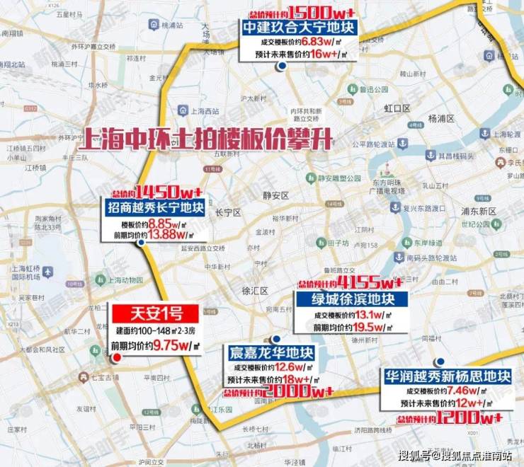 聚焦中环沿线来看,靠近中环的大宁、北新泾土拍楼板价破8w+/㎡,新房售价将达到13-16w+/㎡的水平,同样中环附近的「天安1号」以10w/㎡以内的均价,堪称中环附近价格洼地的存在!